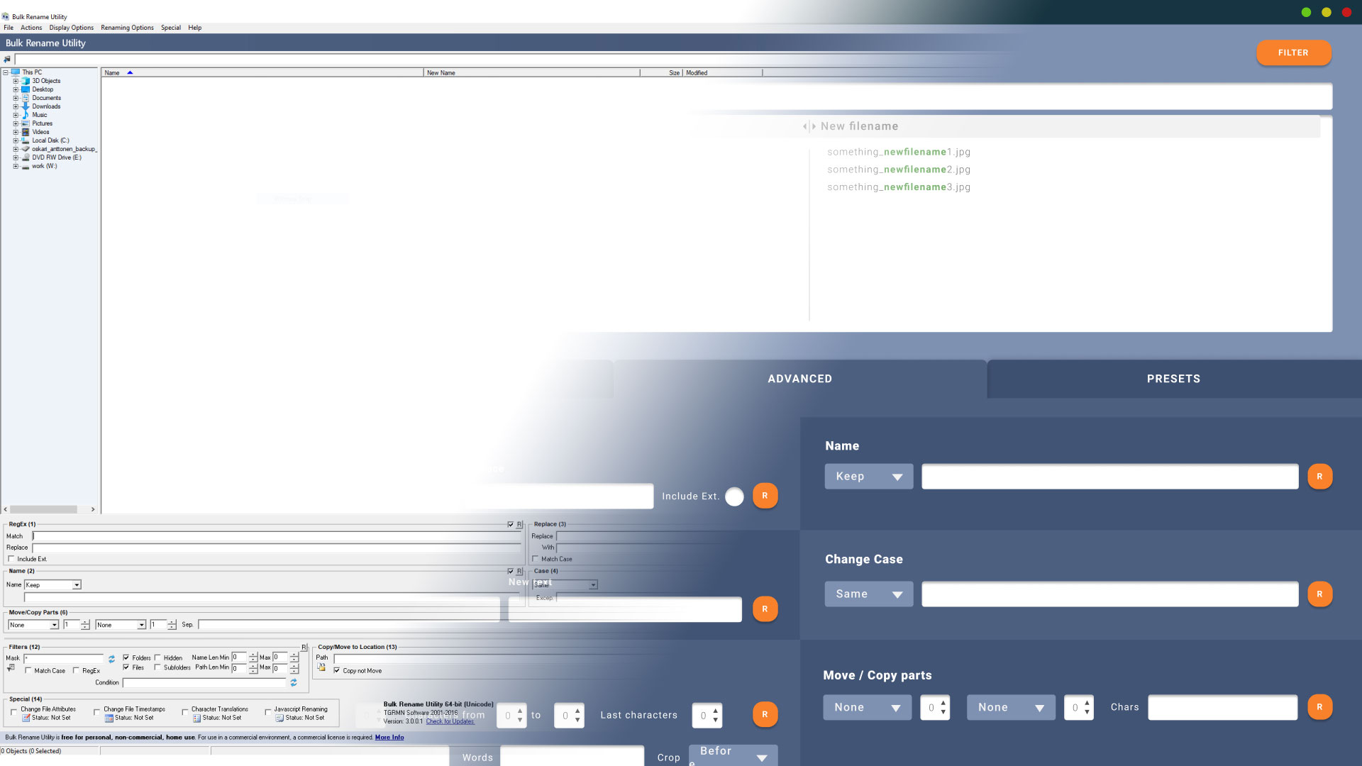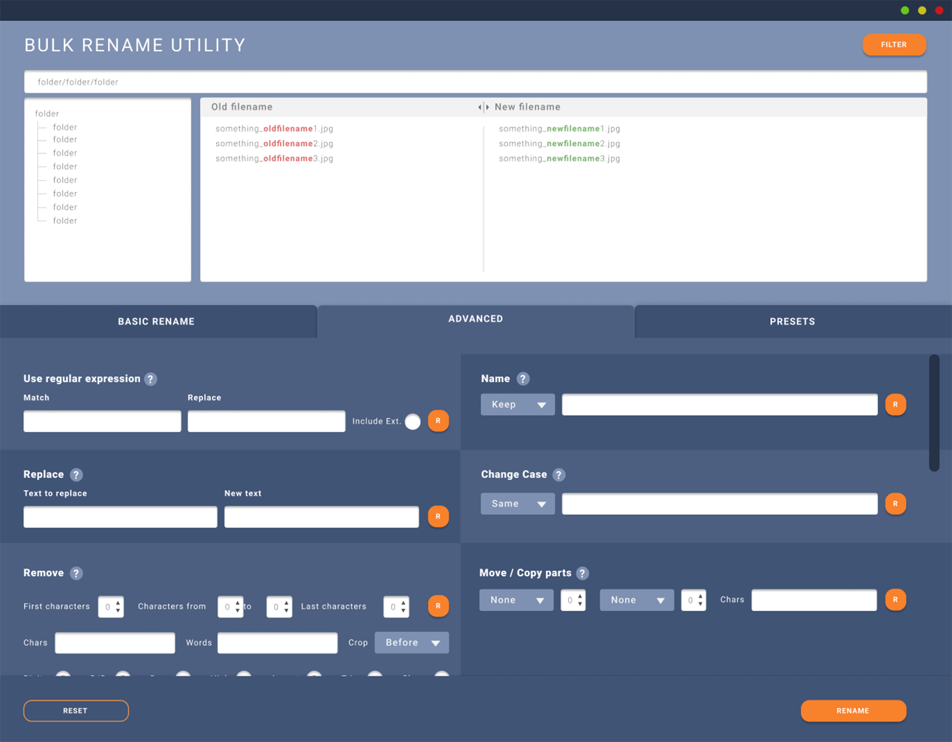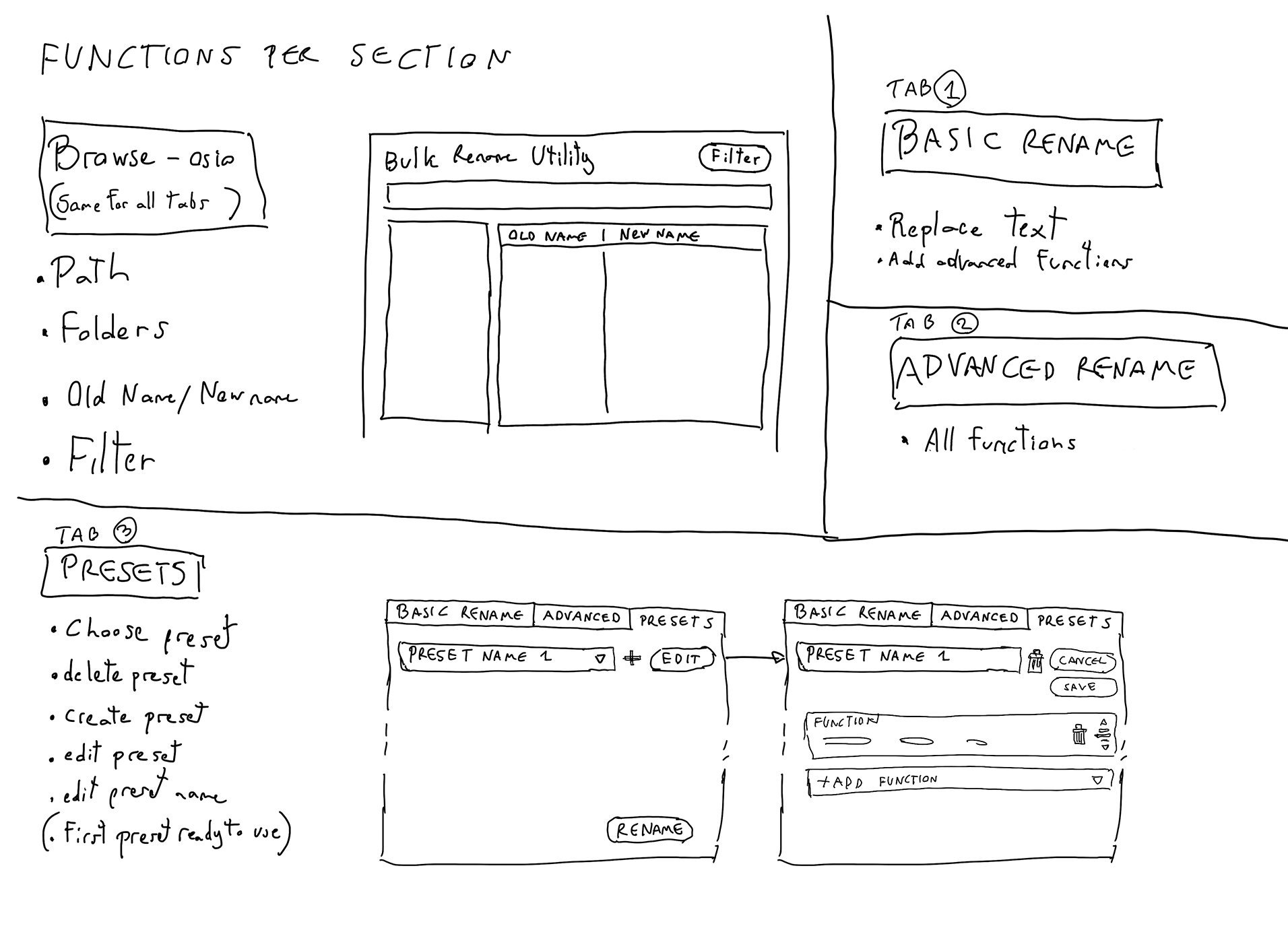 Bulk Rename Utility is a program for Windows that lets you rename many files at once. It has a myriad of options which makes it a very useful and versatile software. The many available renaming options are also part of the problem. The learning curve is steeper than would be optimal for such a small utility, and generally the User Experience and design are outdated. I decided to redesign the application’s functionality and visuals as a personal project.